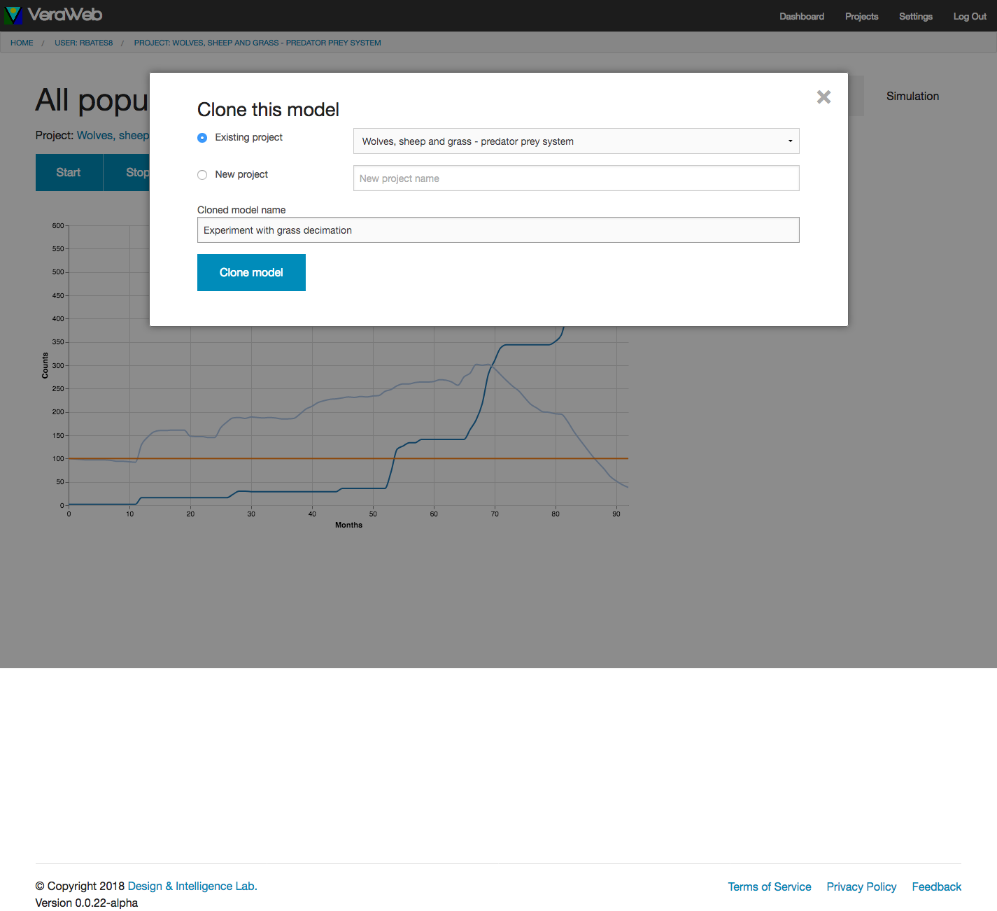 Play with the parameters on the relationships as well to see how they affect the simulation. Once you have a model that exhibits your ecosystem’s baseline behavior, clone it (using the icon next to the model name at the top of the page) to a new model so you can experiment with the new model and not lose your original: