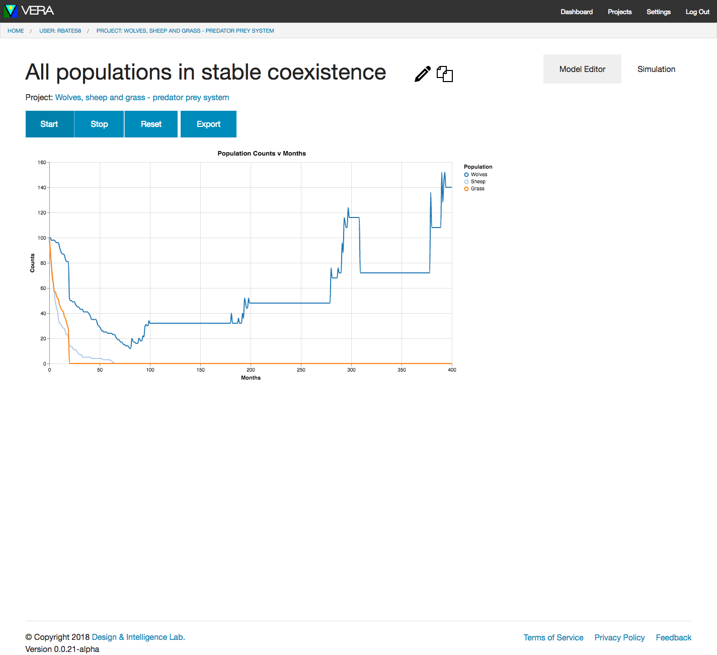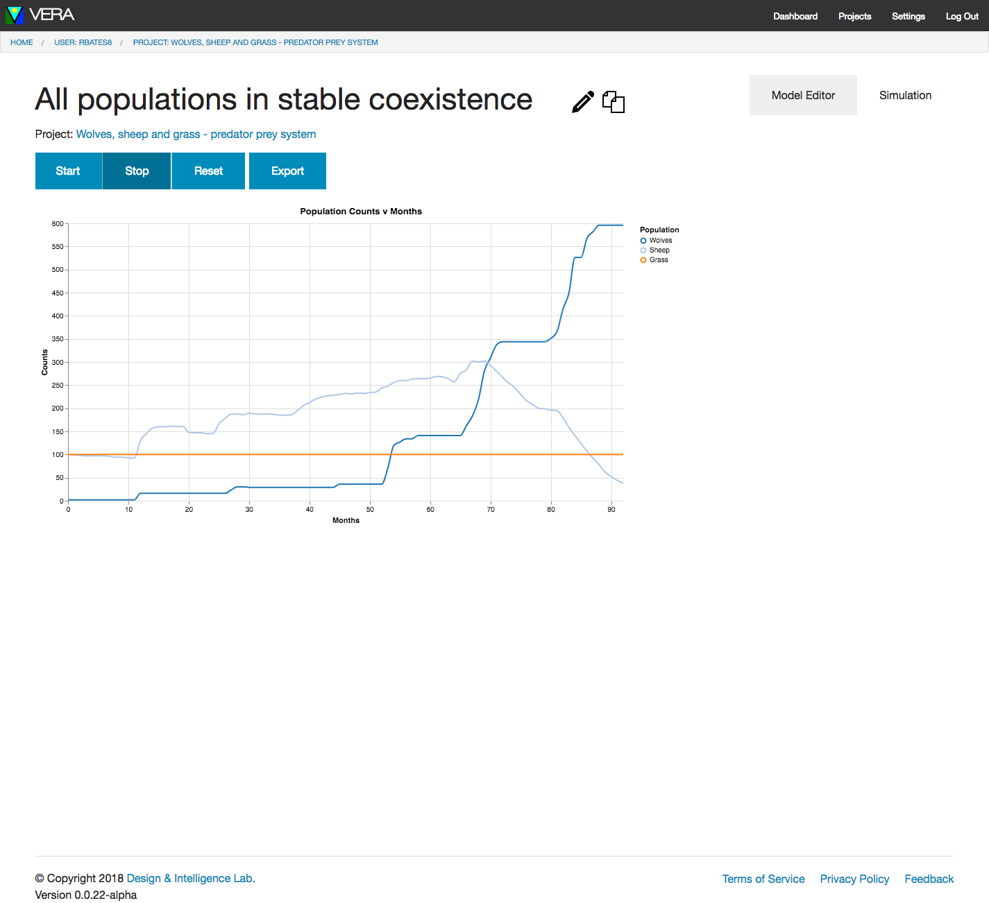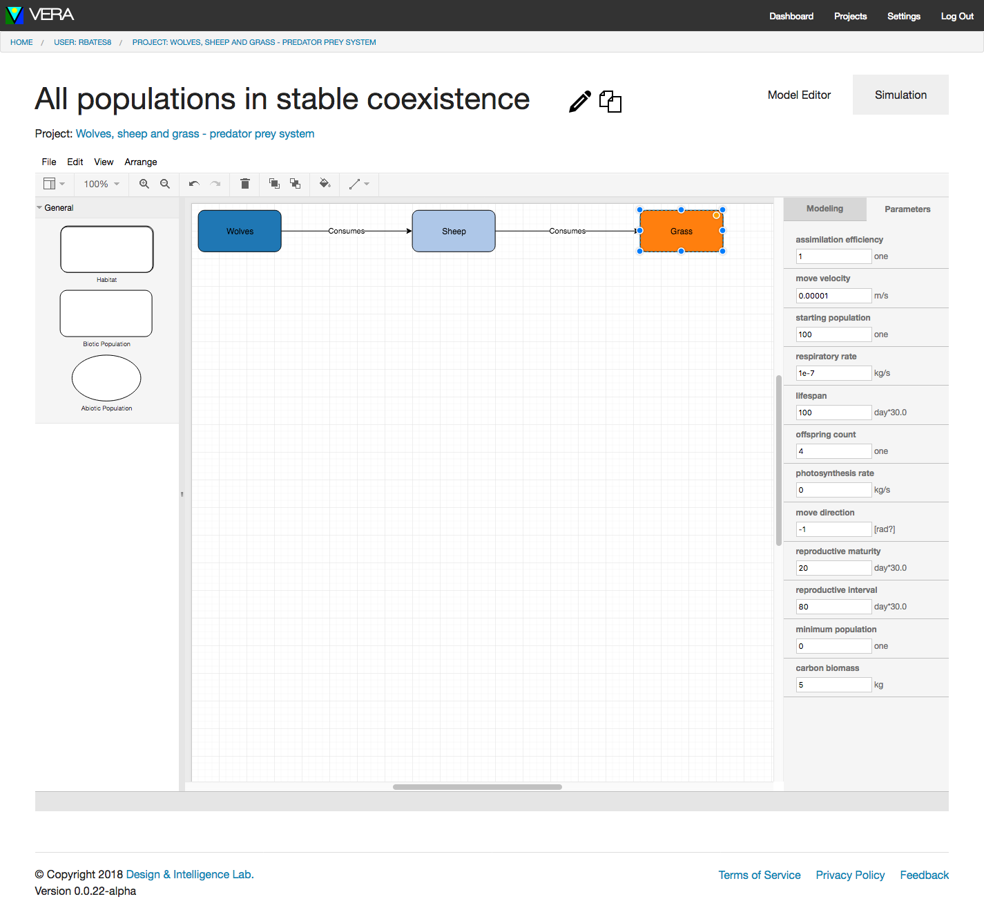 A key feature of VERA is its ability to generate a simulation of the conceptual model we construct so we can validate (or invalidate) our hypothesis. In the case of the simple food web above, we can see how varying populations, lifespan, potential energy, etc. of populations can affect the organisms involved.