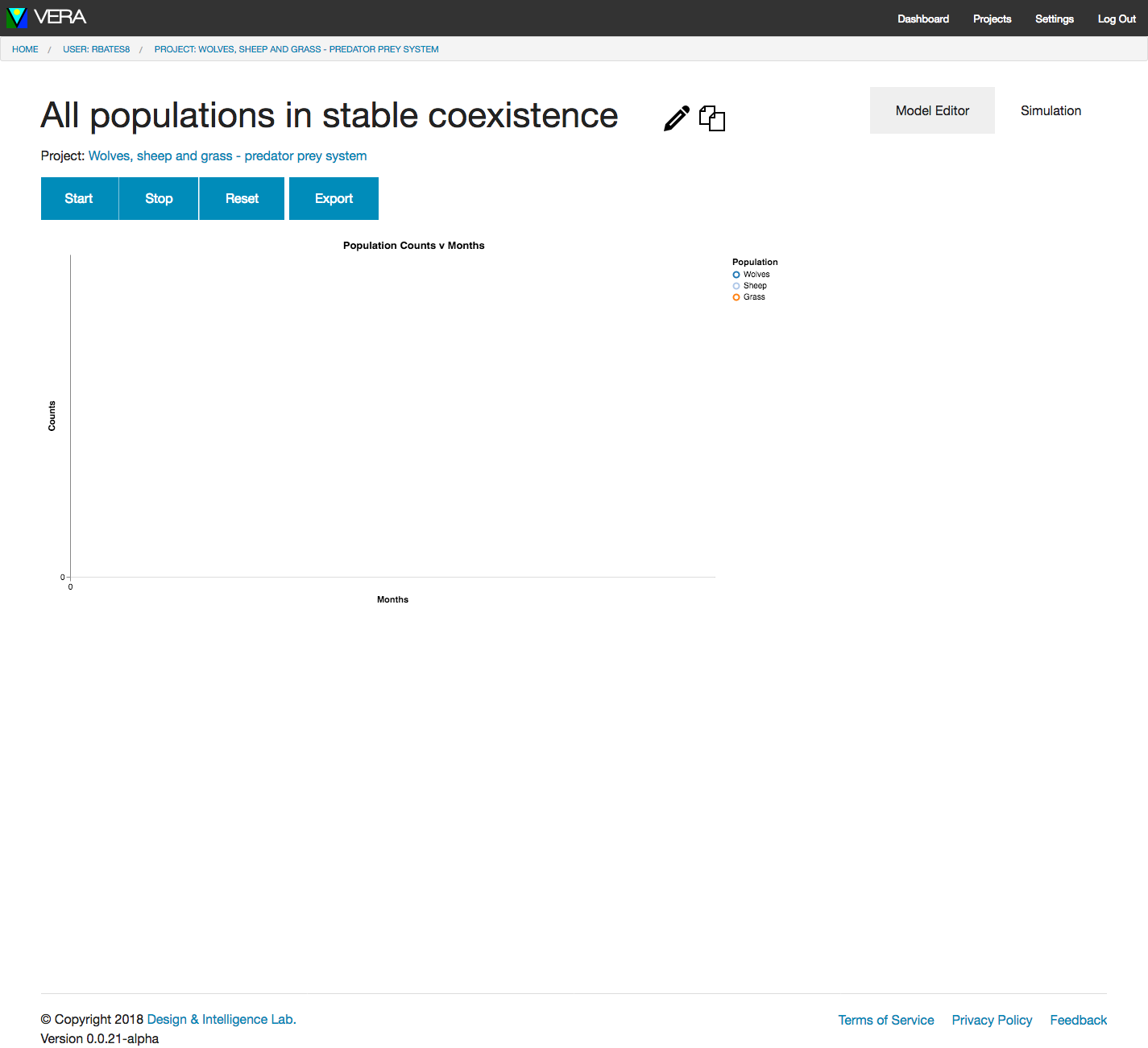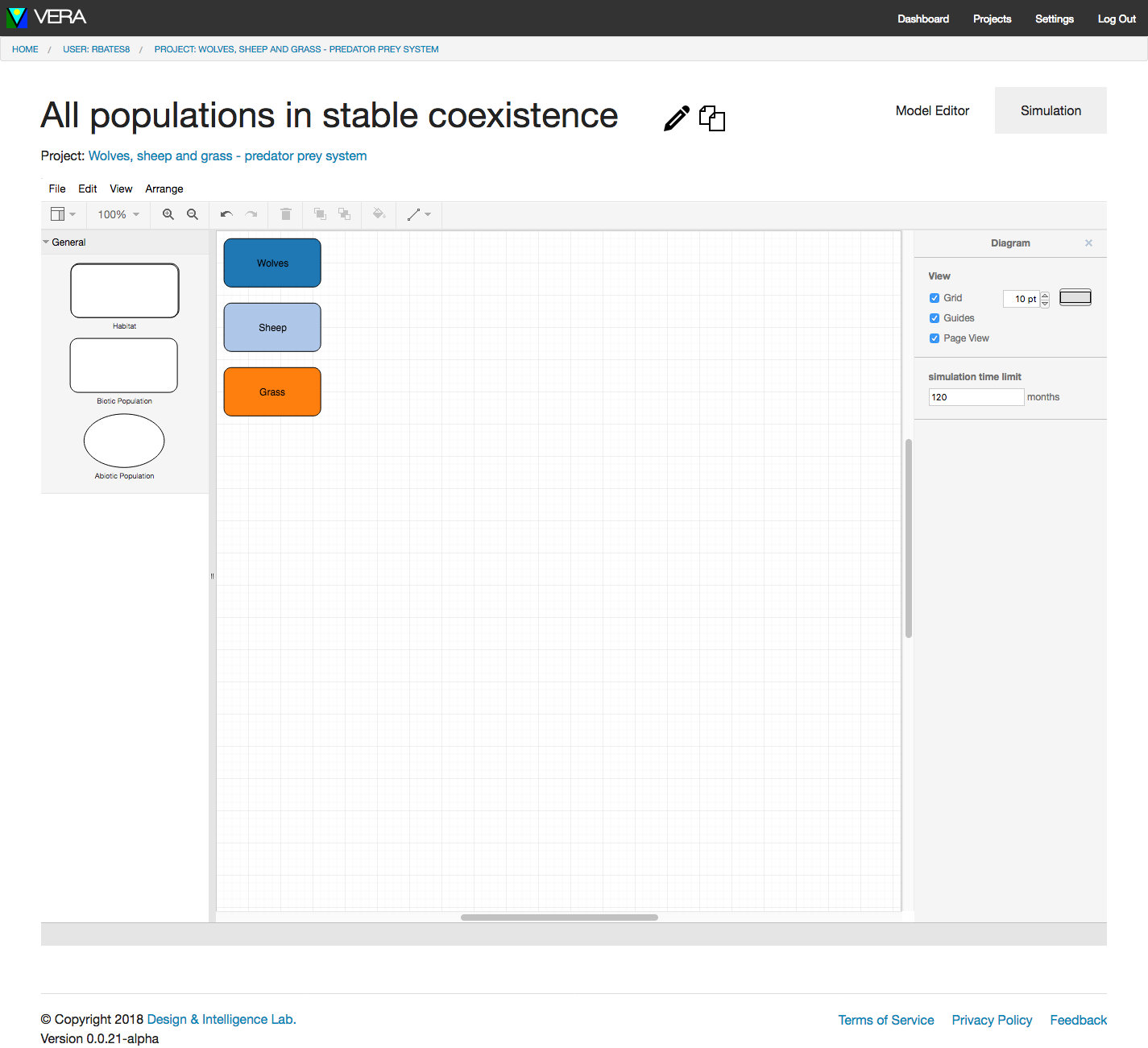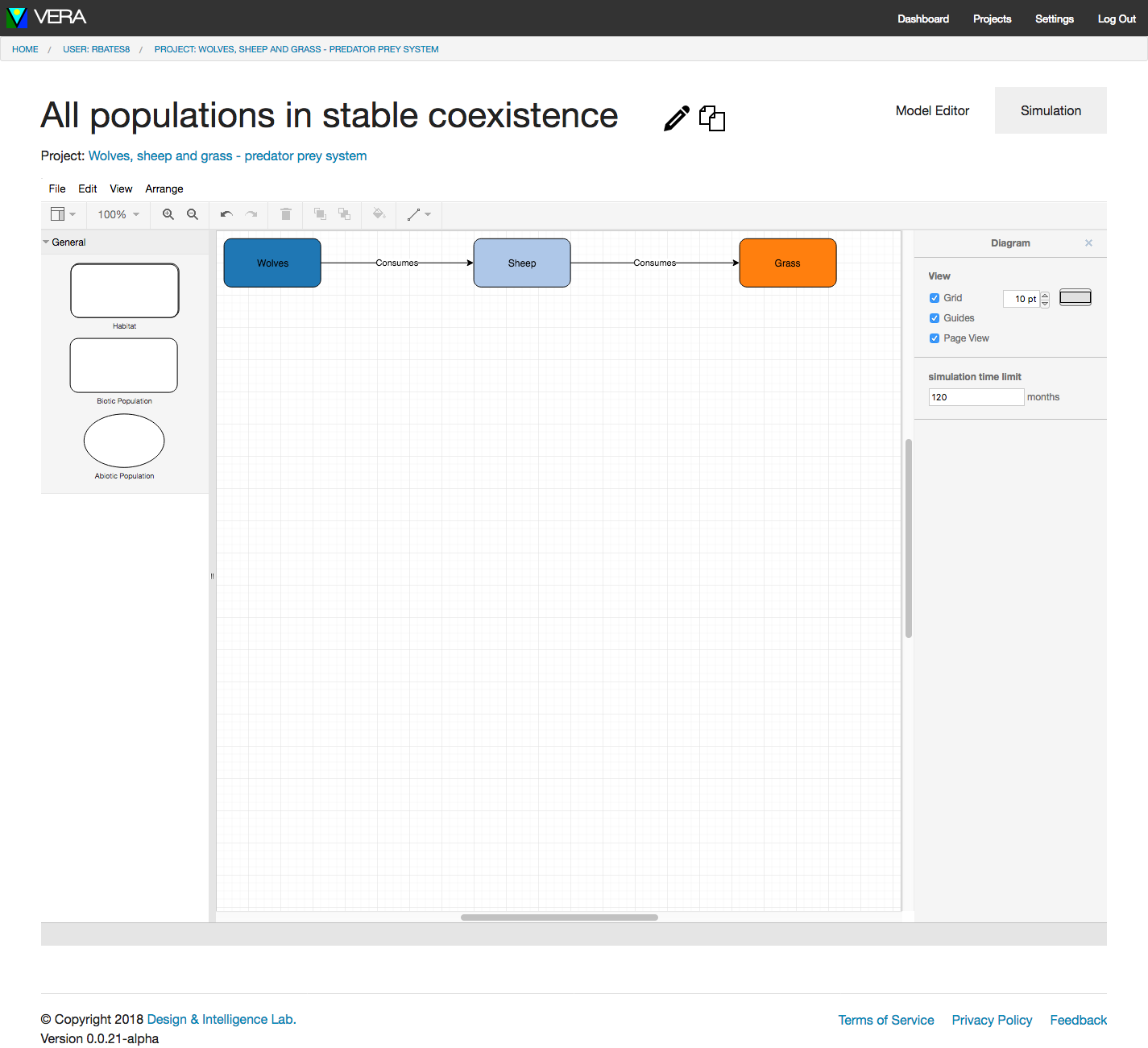 A key feature of VERA is its ability to generate a simulation of the conceptual model we construct so we can validate (or invalidate) our hypothesis. In the case of the simple food web above, we can see how varying populations, lifespan, potential energy, etc. of populations can affect the organisms involved.