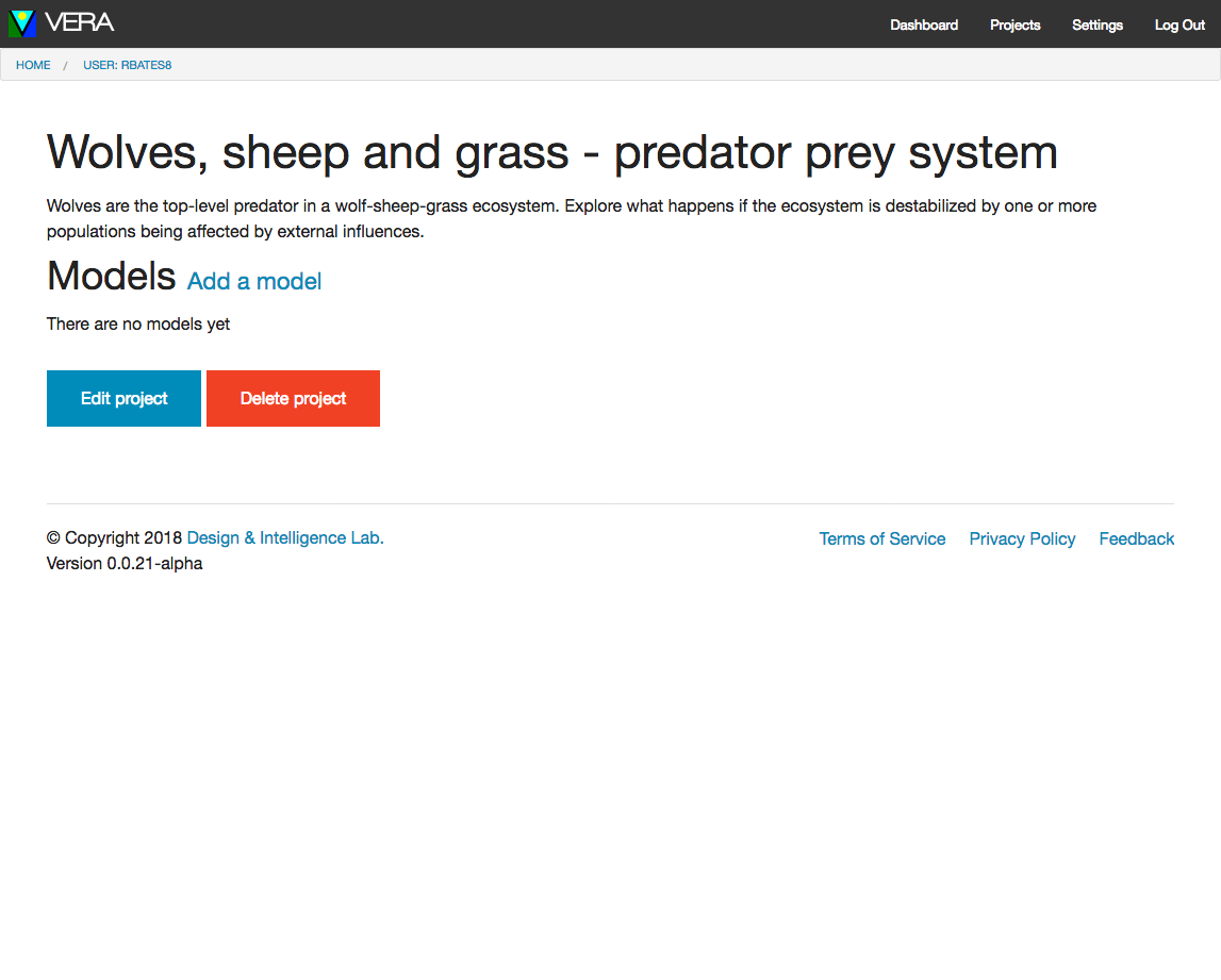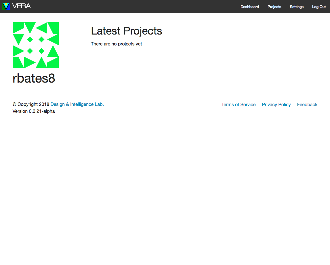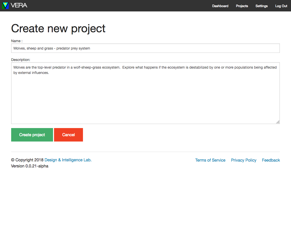 The first step in the VERA workflow is to create a project to describe the phenomenon you are observing and contain the models to test your various hypotheses. To do so, click on the Projects link in the upper right menu to access the Projects landing page: