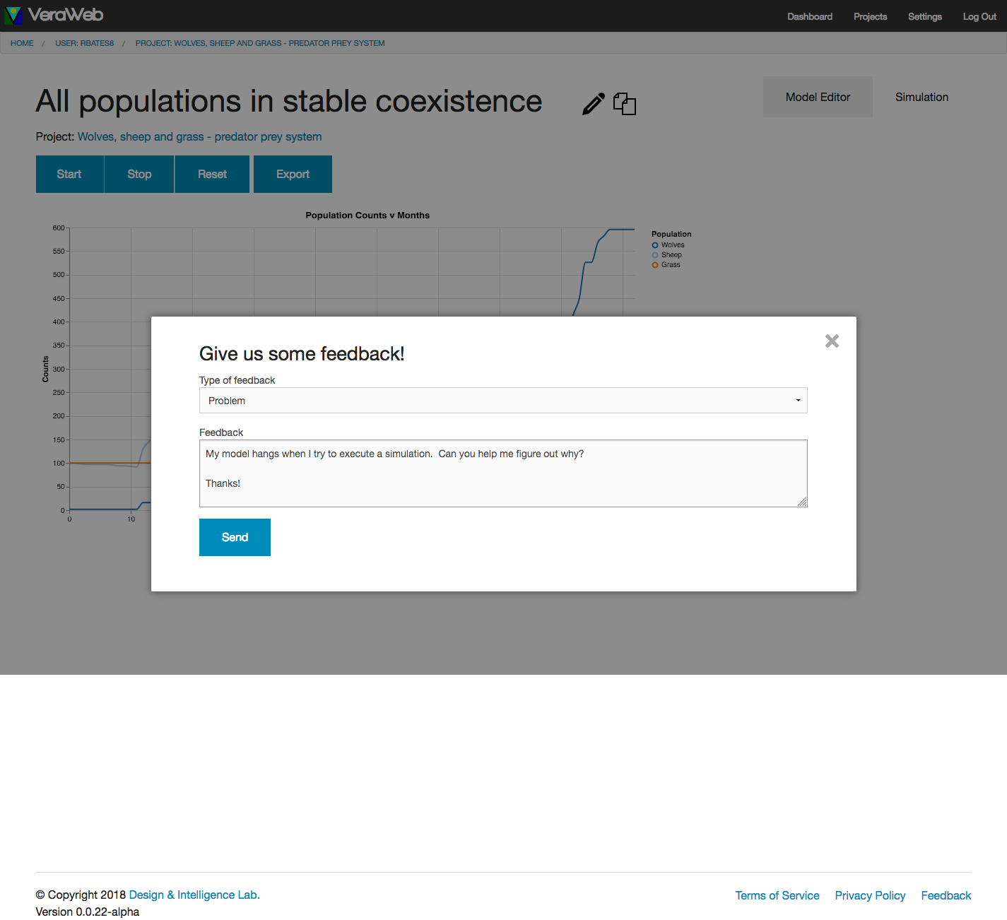 A model by itself often doesn’t support or refute a hypothesis - but simulating the model to observe the behavior of the populations based on their interactions will provide data that can be used to evaluate and/or refine the hypothesis. VERA is able to generate a simulation from a model and execute it in NetLogo (Wilensky, 1999) so that quantitative and qualitative results can be collected. By iterating through model-simulate-refine loops a researcher can thoroughly test a proposed hypothesis